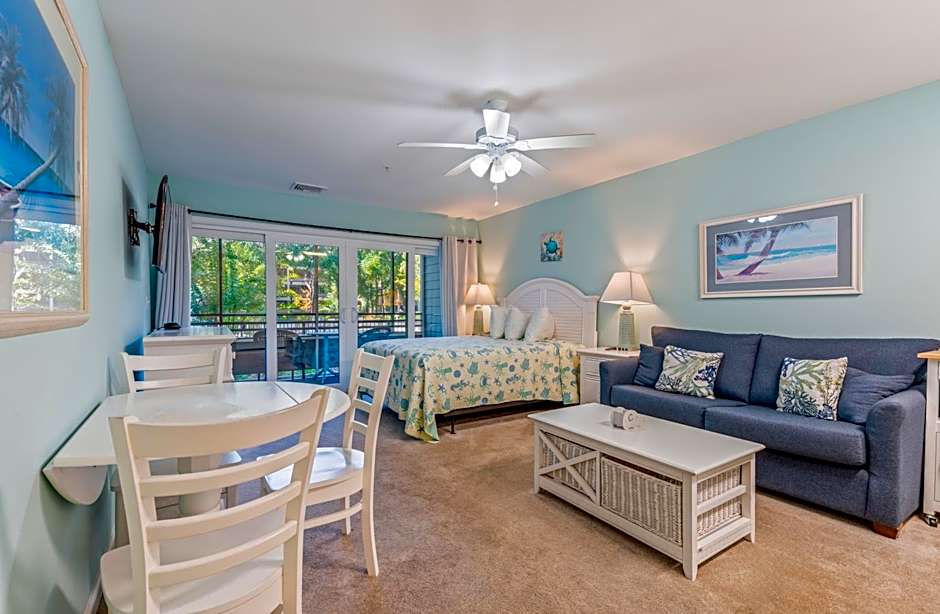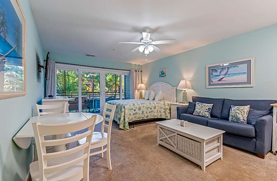 This studio features a seating area and a kitchenette.